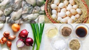 • Cho hàu vào tô rồi thêm 2 quả trứng, hành lá và gia vị vừa ăn và khuấy thật đều tay.