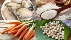 • Hạt sen và gạo cho vào nồi ninh đến khi cháo nhừ thì cho thịt hàu, cà rốt, nấm rơm vào nấu cùng. Để thêm hấp dẫn và thơm ngon, bạn có thể bỏ thêm hành, mùi ta vào cháo.